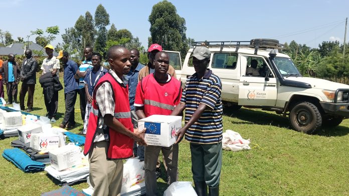 Red Cross Officials handing over kitchen utensils and beddings to Chesiywo families displaced by heavy floods/TONY WAFULA